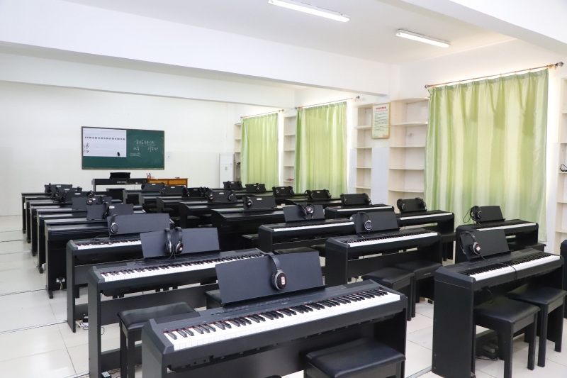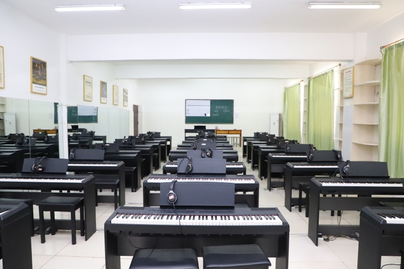 数码钢琴实训室配备标准化电钢琴,每架钢琴都配有头戴式耳机和琴凳,可开设的实训项目有钢琴伴奏教学、幼儿音乐等实训课程,为提高学生的儿歌伴奏能力提供平台。数码钢琴实训室供婴幼儿托育服务与管理、学前教育专业学生使用。