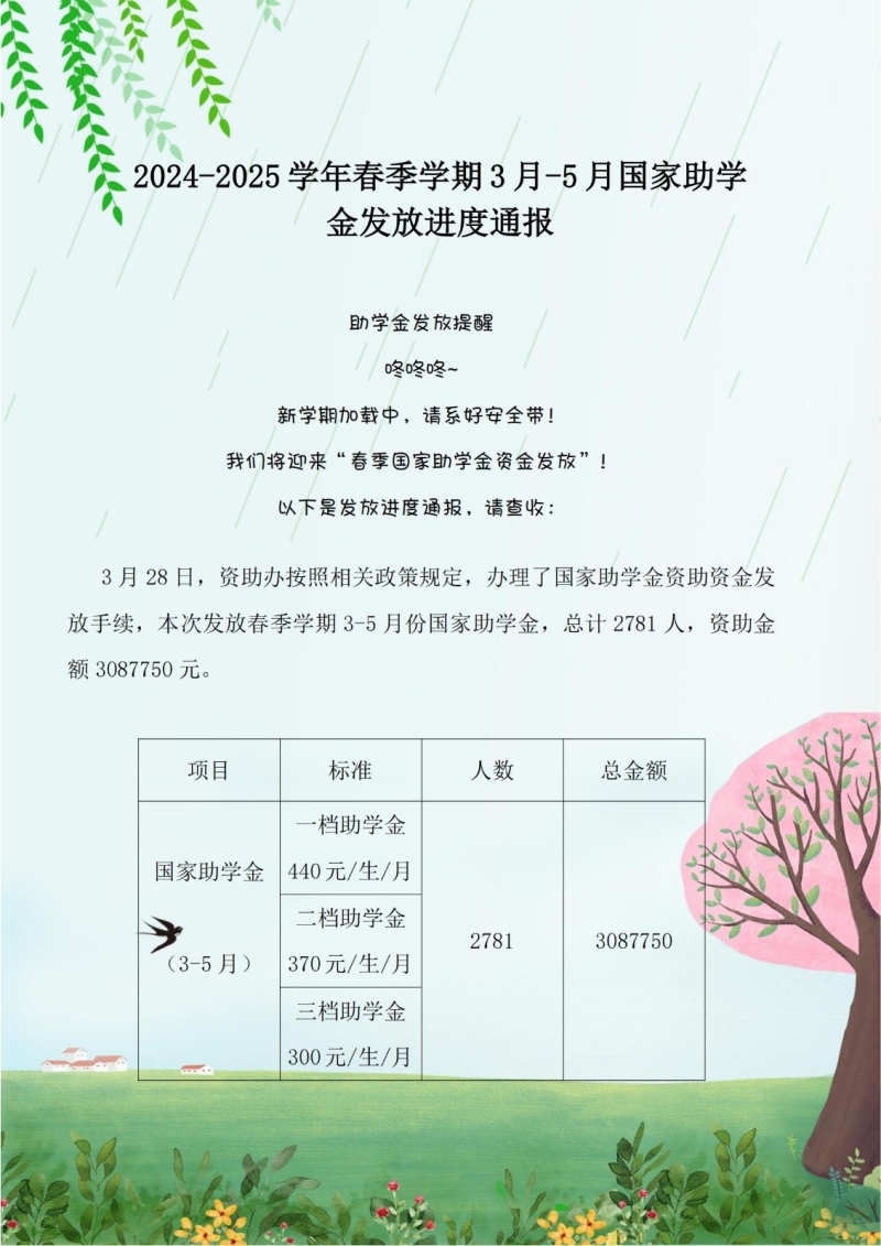 2024-2025学年春季学期3月-5月国家助学金发放进度通报