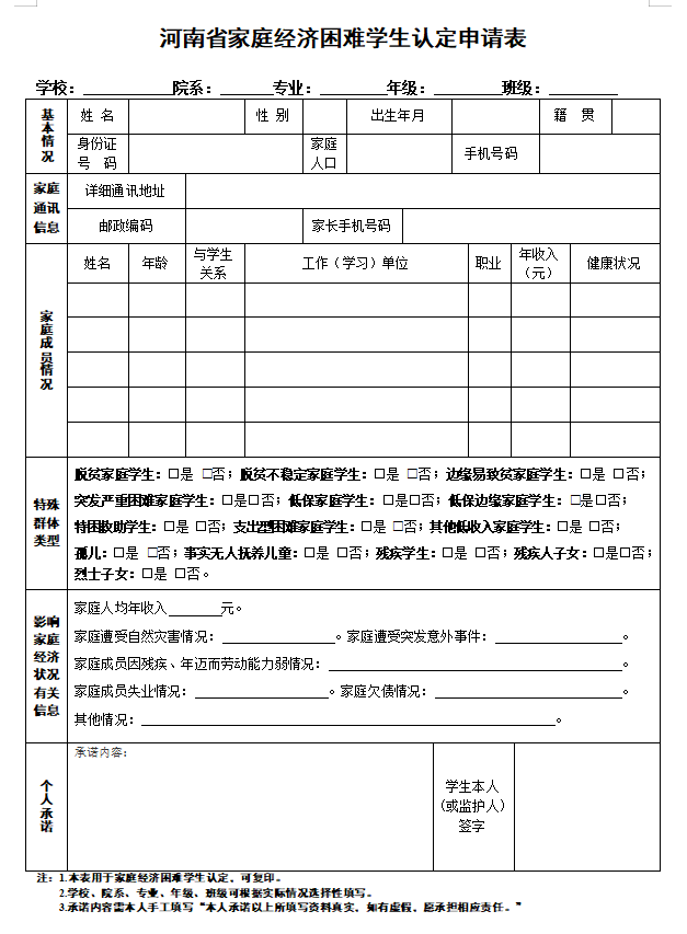 (二)学生申请。学生自愿如实填报《河南省家庭经济困难学生认定申请表》(见附件1,以下简称《申请表》),同时登录河南省高校学生资助在线系统提交困难认定申请。学生对提供信息的真实性负责,并作出书面承诺。