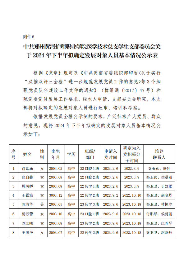 中共437ccm必赢国际官方网站医学技术总支学生支部委员会关于2024年下半年拟确定发展对象人员基本情况公示表